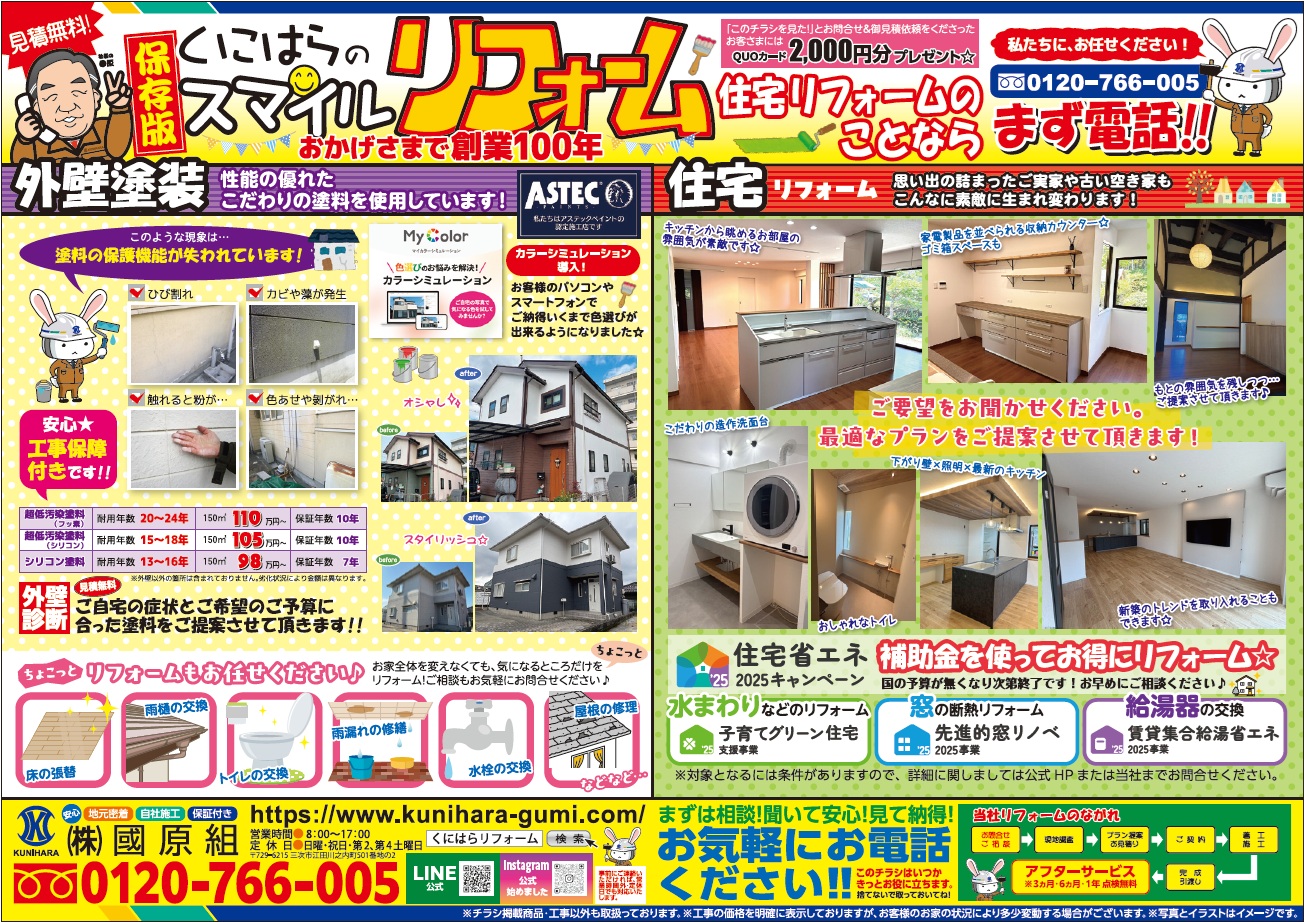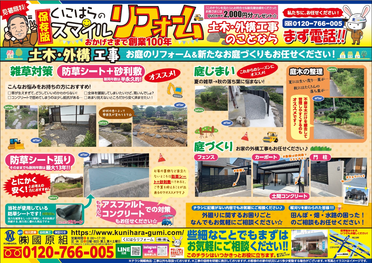最新のチラシ情報(R7/9/20)投函 2025.09.19 Post Share Hatena Pocket RSS feedly Pin it この記事のタイトルとURLをコピーする 今なら、このチラシを見てお問合せ&御見積依頼をしてくださったお客様には QUOカード2000円分をプレゼントさせて頂きます! ぜひ、この機会にご検討ください♪ Post Share Hatena Pocket RSS feedly Pin it この記事のタイトルとURLをコピーする インスタグラムはじめました。 前の記事 第9回 まちゼミに参加致します♪ 次の記事